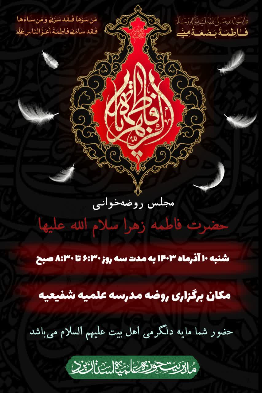 به گزارش واحد رسانه حوزه علمیه استان یزد، مراسم روضهخوانی حضرت فاطمه زهرا سلام الله علیها از شنبه ١٠ آذرماه ١۴٠٣ به مدت سه روز ساعت ۶:٣٠ تا ٨:٣٠ صبح در مدرسه علمیه شفیعیه برگزار می شود.