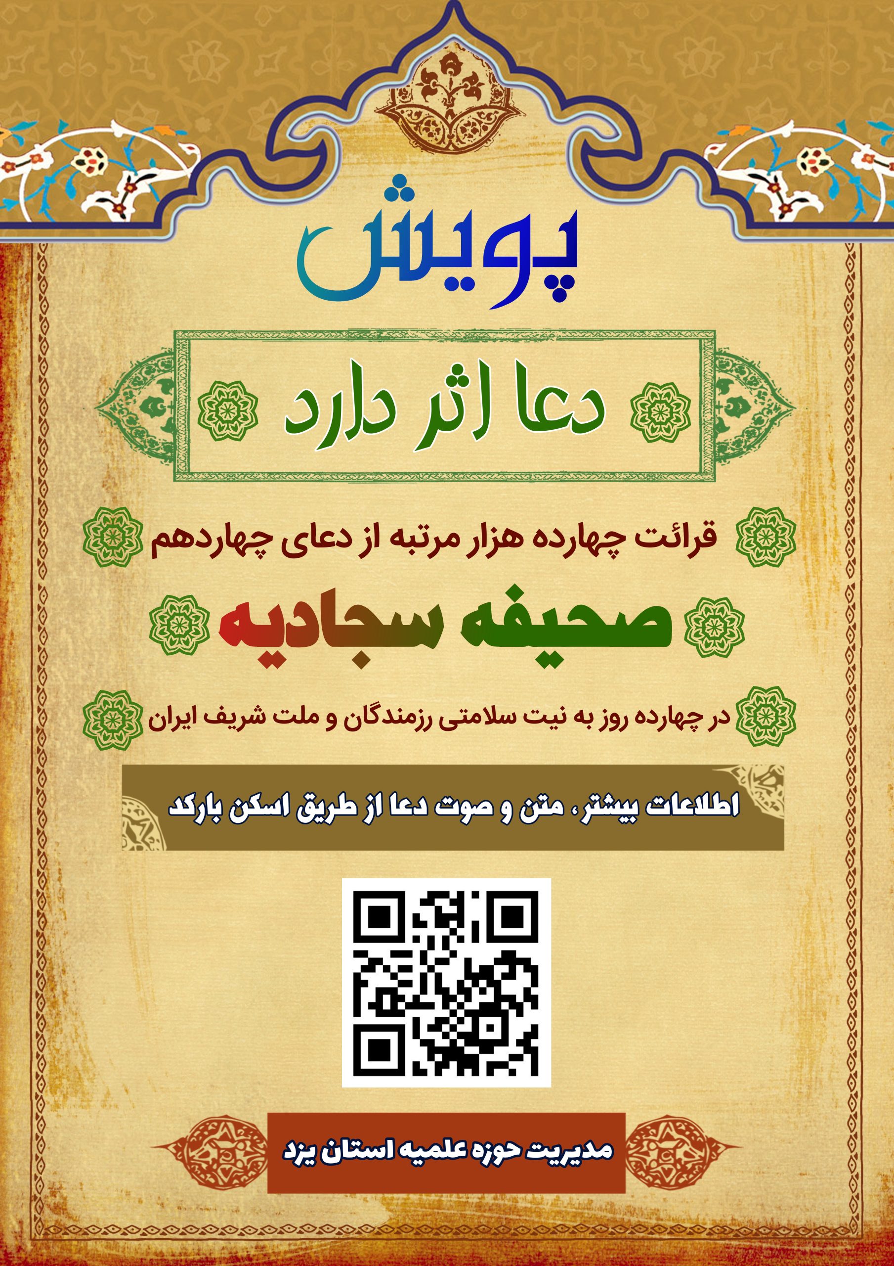 به گزارش خبرنگار خبرگزاری حوزه از یزد، مجموعه مدیریت حوزه علمیه استان یزد پویش “دعا اثر دارد” را در شرایط جنگی و حملات هوایی رژیم جنایتکار صهیونی به خاک مقدس جمهوری اسلامی ایران،برگزار می نماید.