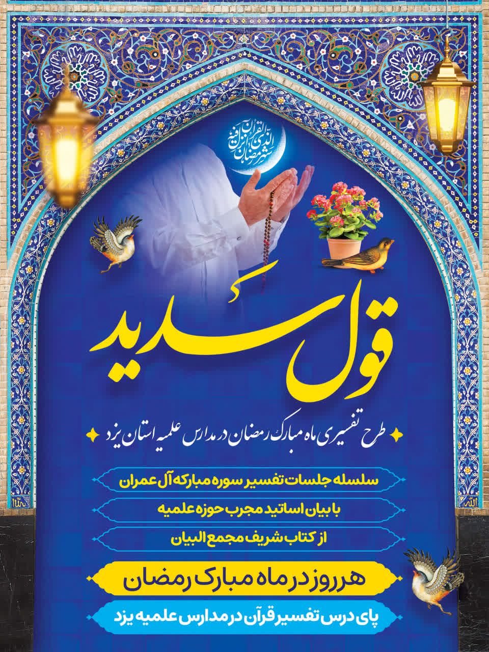 سید علیرضا میرجلیلی عنوان کرد: بر اساس این طرح “قول سدید” تمامی مدارس علمیه استان یزد موظف هستند تا هر روز در ایام ماه مبارک رمضان، پیش یا پس از اقامه نماز ظهرین، جلسهای در حدود ۳۰ دقیقه برگزار نمایند که در این جلسات، اساتید معرفیشده، آیاتی از سوره آلعمران را با استفاده از تفسیر مجمعالبیان تبیین میکنند و همچنین در کنار مباحث تفسیری، یک آیه موضوعی منتخب نیز به صورت روزانه توسط طلاب حفظ میگردد تا بُعد حفظ و انس عملی با قرآن نیز تقویت گردد.